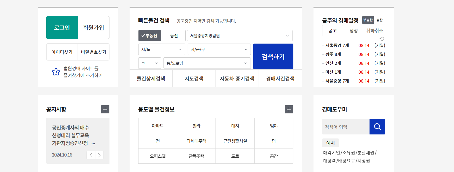 - 경매절차 안내: 부동산 경매의 전체적인 절차와 방법에 대한 상세 설명